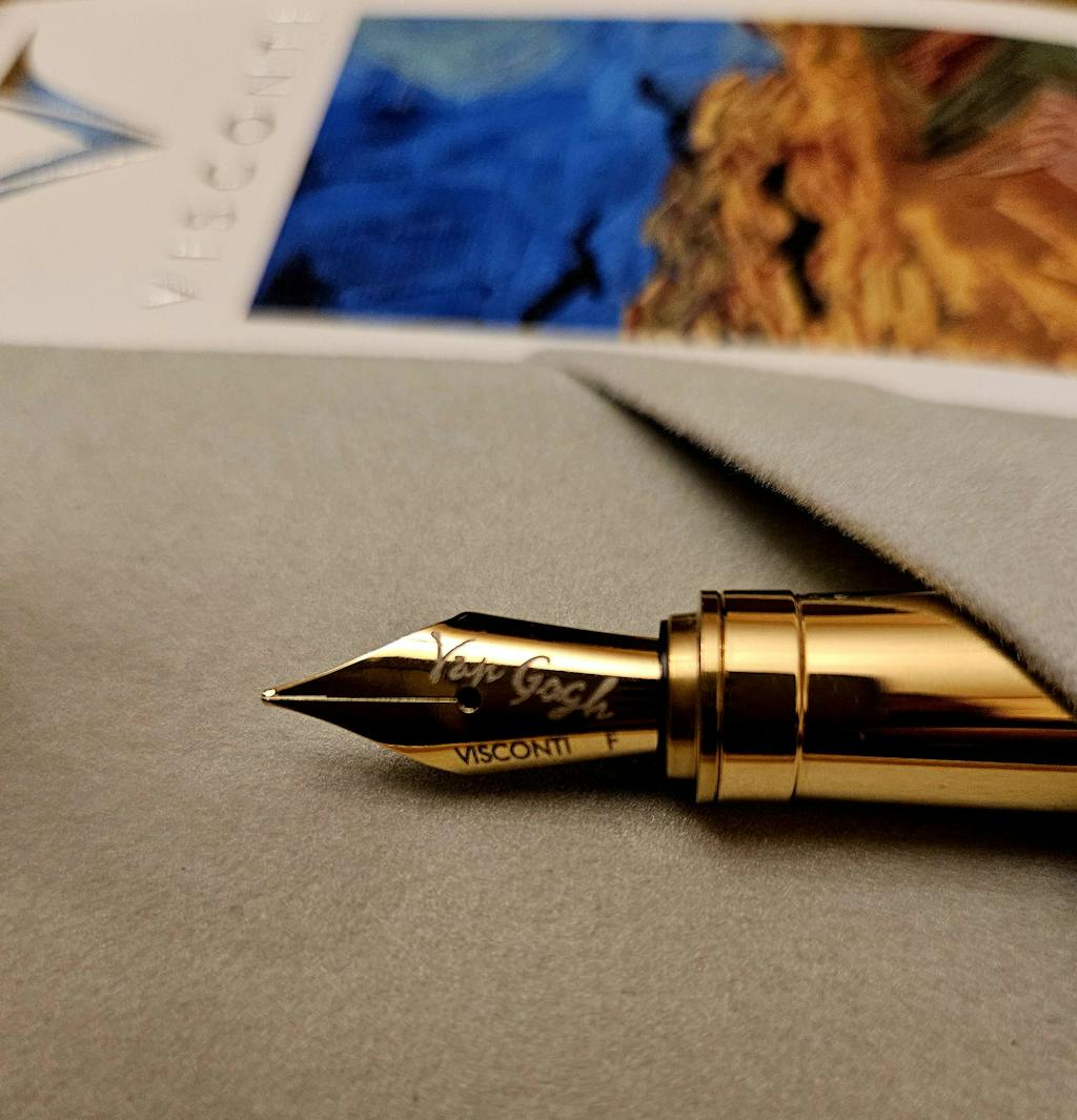 • Made from natural resin uniquely mixed to represent palettes of oil paint, this Visconti Van Gogh series is inspired by the artist's color and technique.This Wheatfield with Crows inspired blue fountain pen features a gold-plated stainless steel nib. it comes in a special gift box that includes a matching bottle of a new Visconti cobalt blue ink. This special edition is dated and numbered, limited to 3500 pieces in total, and the nib is unobtrusively and elegantly engraved with the artist's name.