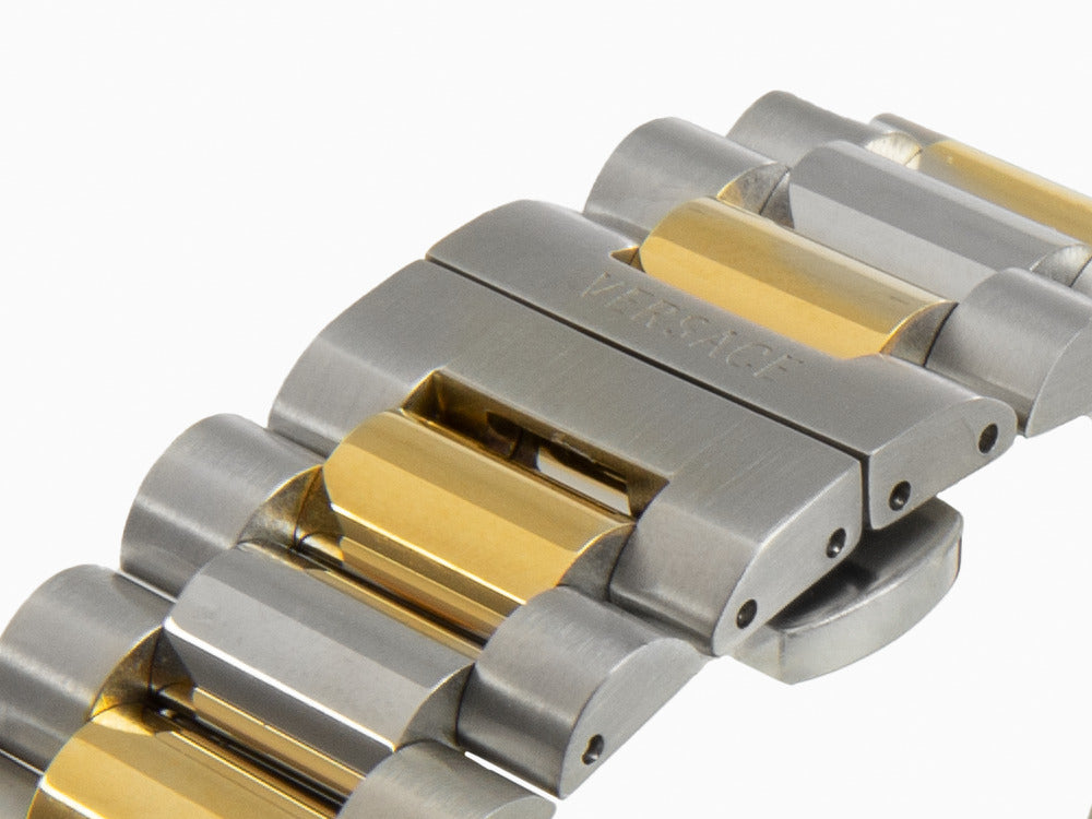 • The Versace V Dome watch features a white guilloché dial covered by sapphire glass. The detail of the golden crown, the golden bezel, and the 3D medusa inside the case match perfectly with the two-tone steel bracelet, making it a classic from the brand.